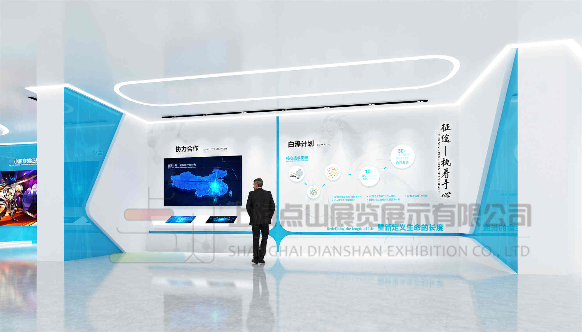 吳孟超腫瘤醫(yī)院企業(yè)文化展示項目圍繞醫(yī)院屬性和白澤計劃內(nèi)涵進(jìn)行布展策劃,空間規(guī)劃合理設(shè)計展示空間和功能空間,參觀動線流暢且滿足多中參觀群體需求,空間呈現(xiàn)干凈通透,內(nèi)容傳輸趣味十足,讓參觀者在觀、感、玩中了解白澤計劃的對人類健康的重要作用。