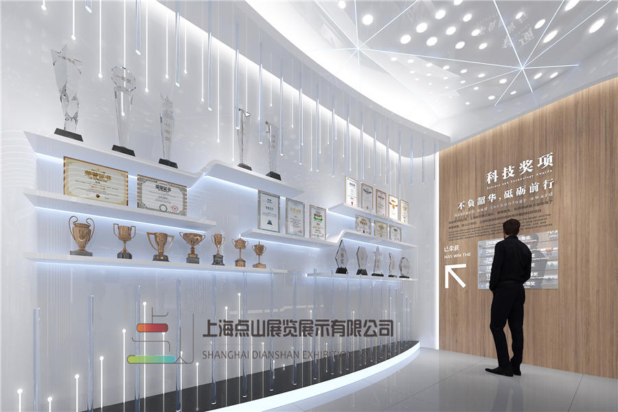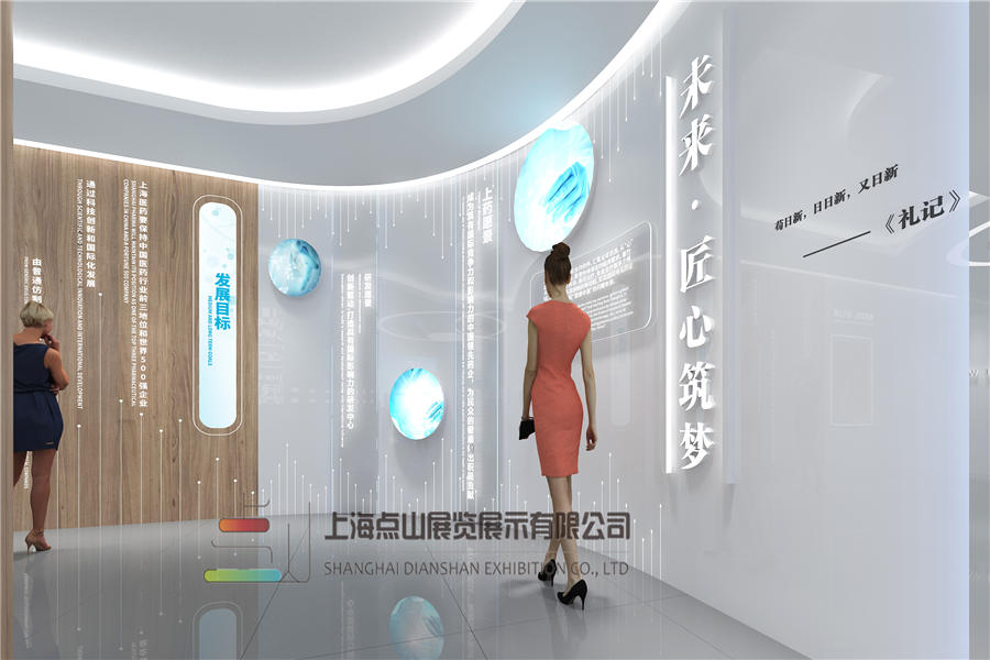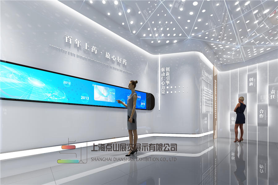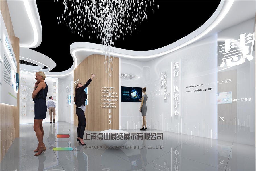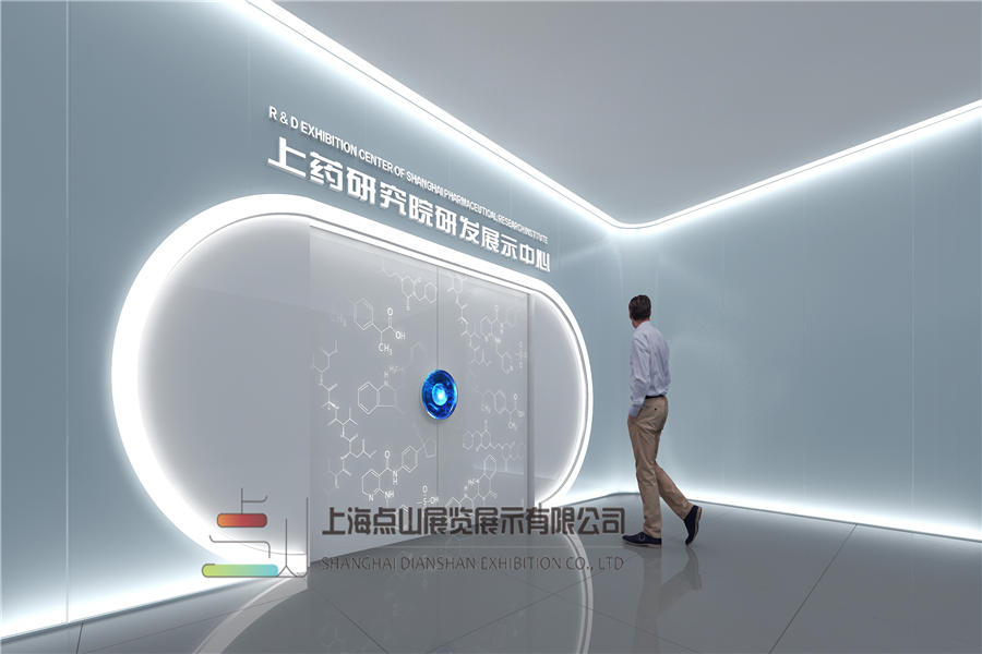 展廳包括企業(yè)文化篇、發(fā)展篇、研發(fā)成果篇、和未來愿景篇。設(shè)計(jì)師汲取企業(yè)LOGO、企業(yè)文化并結(jié)合了藥品研發(fā)特性等相關(guān)元素,使整個空間充滿靈動、科技和未來感。其中展廳中的研發(fā)樹藝術(shù)裝置,由藥品化學(xué)元素組成,視角由上至下寓意科研萃取藥素精華,視角由下至上也寓意上藥能量樹,生根于土地,生生不息。點(diǎn)亮了整個展廳,參觀者互動留影,傳遞帶走上藥精神。
