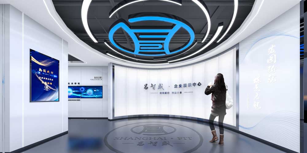 進(jìn)入展廳后依據(jù)企業(yè)薄膜產(chǎn)品特性藝術(shù)演化的弧形亞克力背景墻映入眼簾,頂面和地面的造型采用了企業(yè)LOGO的元素,同時也呼應(yīng)著中國天圓地方的傳統(tǒng)理念,有限的空間內(nèi),整體給人一種恢弘大氣的感覺。