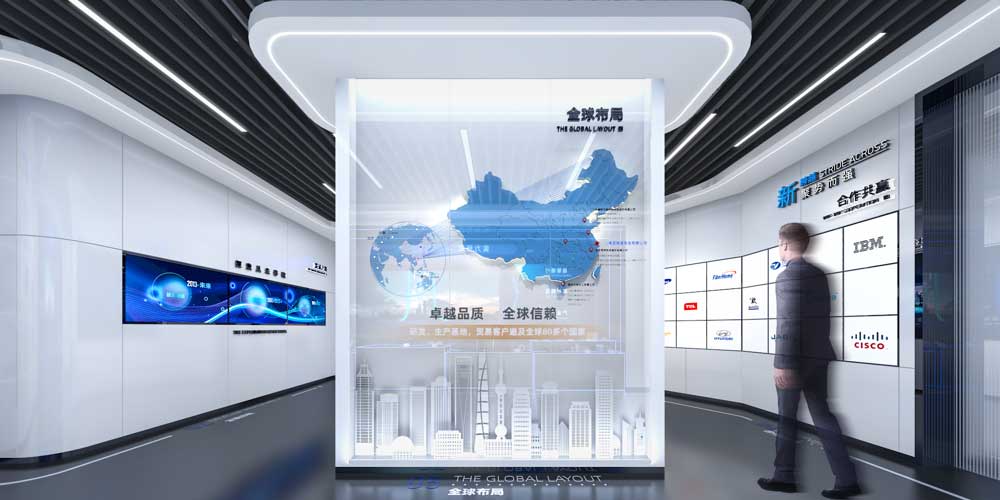 全球布局我們采用了立體地圖,配合貼在玻璃上的文字和圖標(biāo)可直觀的了解到集團(tuán)在全球化發(fā)展達(dá)到的成就,同時也便于更換,下方的上海地標(biāo)和部分其他國家的建筑地標(biāo),寓意著集團(tuán)立足于上海,輻射全球的戰(zhàn)略眼光。