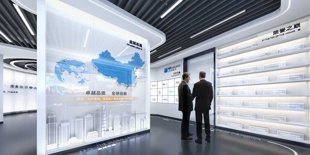 提取了集團(tuán)的高性能薄膜和樹脂材料的通透特性演化而來的水晶磚,展示集團(tuán)的各項榮譽(yù),水晶配合著燈光,顯得十分精致。