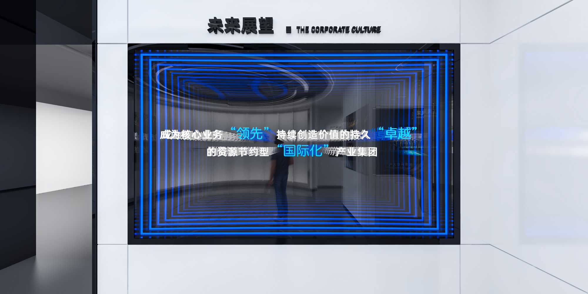 我們將對未來的期許,通過網(wǎng)紅深淵鏡的表現(xiàn)形式,賦予口號的文字內(nèi)容進(jìn)行表達(dá),深淵鏡有無限延伸感,讓觀者產(chǎn)生無限遐想。另外在參觀者剛進(jìn)入展廳時,出口的電動門默認(rèn)是關(guān)閉的,這樣也利于引導(dǎo)參觀者按照預(yù)設(shè)動線進(jìn)行參觀。