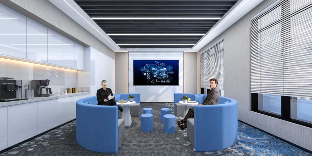 功能廳左邊為淺木紋的茶水柜,組合式的沙發(fā)可以根據(jù)使用需要組合成各種模式和擺放位置,設(shè)置100寸顯示屏幕可以用來播放當(dāng)下需要的內(nèi)容。可作為休閑廳/小型報告廳/小型會議廳使用。