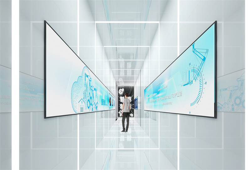 首現(xiàn)映入眼簾的是展廳的大廳,印象/藝術(shù)裝置/形象墻:序廳整體空間干凈明亮,提取工業(yè)元素與科技元素進(jìn)行融合,采用流光燈帶的表現(xiàn)手法。